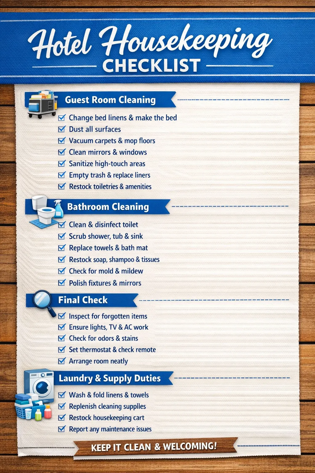 A structured housekeeping checklist creates a clear system that staff can follow for every room. It removes guesswork, improves efficiency, and helps maintain consistent standards—even during busy periods or staff turnover.