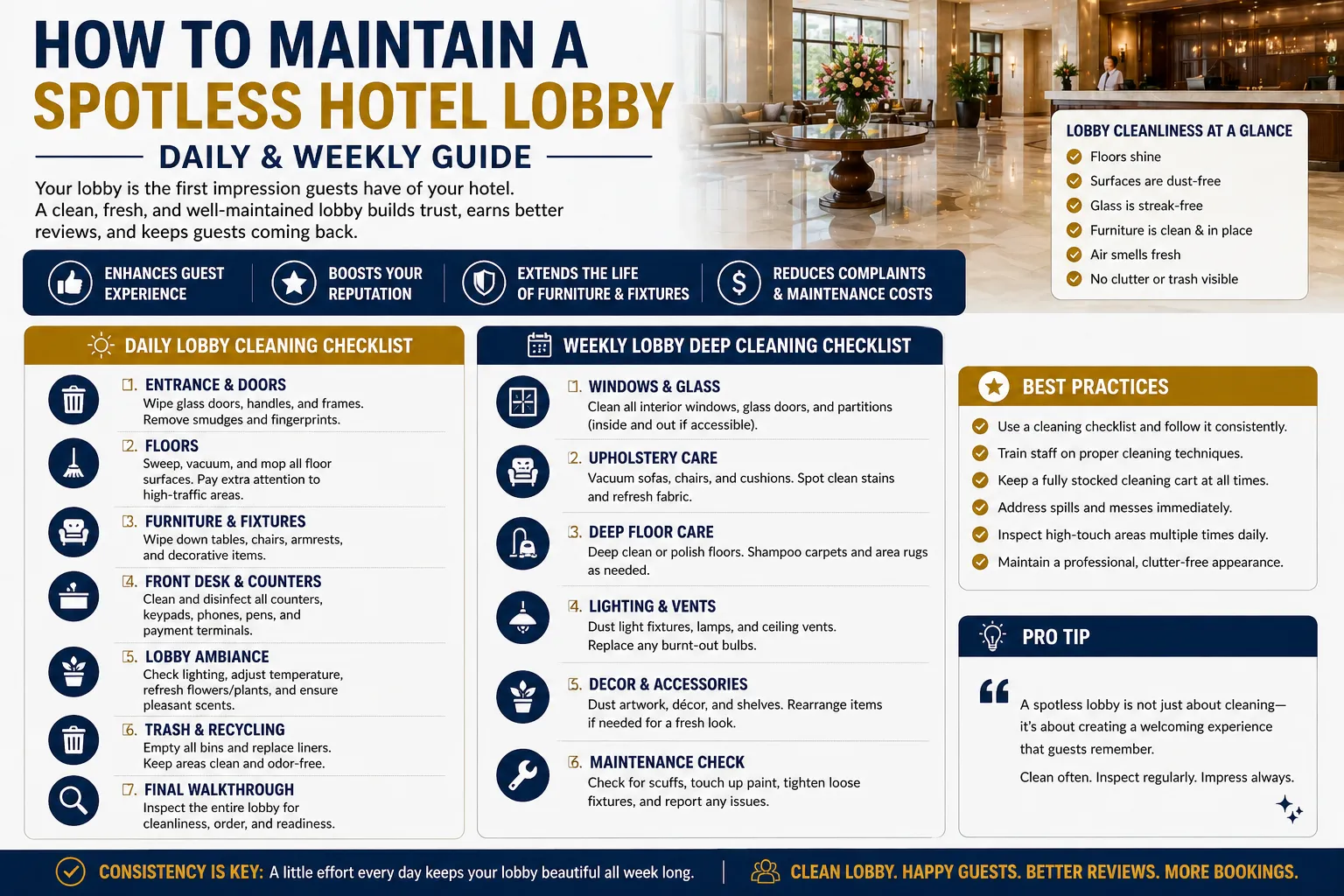 This comprehensive guide outlines daily, weekly, and strategic cleaning practices to help you maintain a consistently pristine, guest-ready lobby.