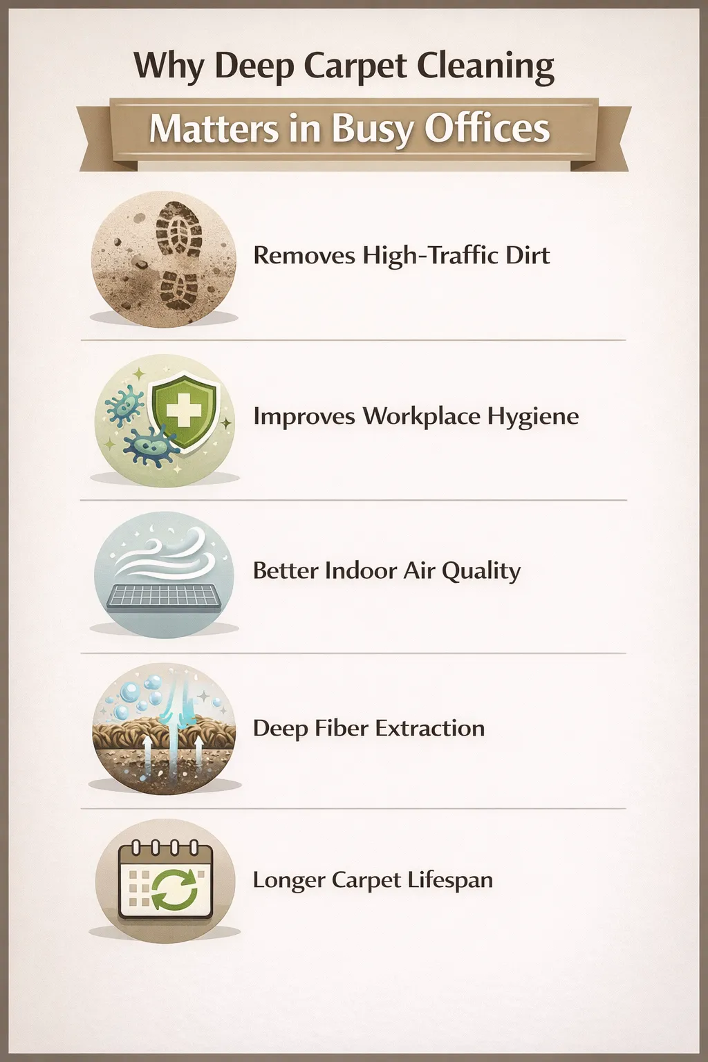 Carpets are one of the largest visible surfaces in an office—so when they look worn, the whole space can feel less polished. Deep cleaning helps with: