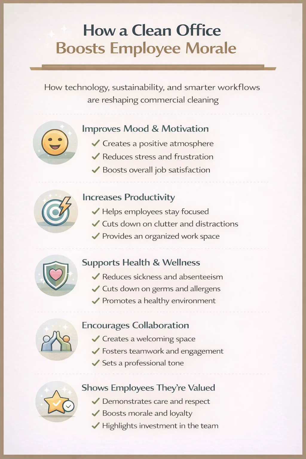 Cleanliness appeals to the senses, and sensory comfort is a shortcut to higher morale: employees feel more energized, less irritated, and more willing to engage.