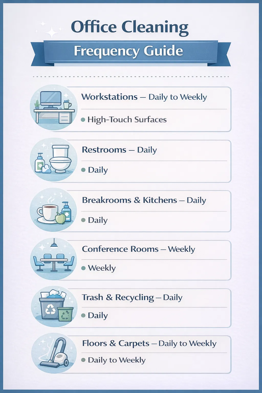This guide breaks down how often you should clean common office areas—and why those frequencies matter.