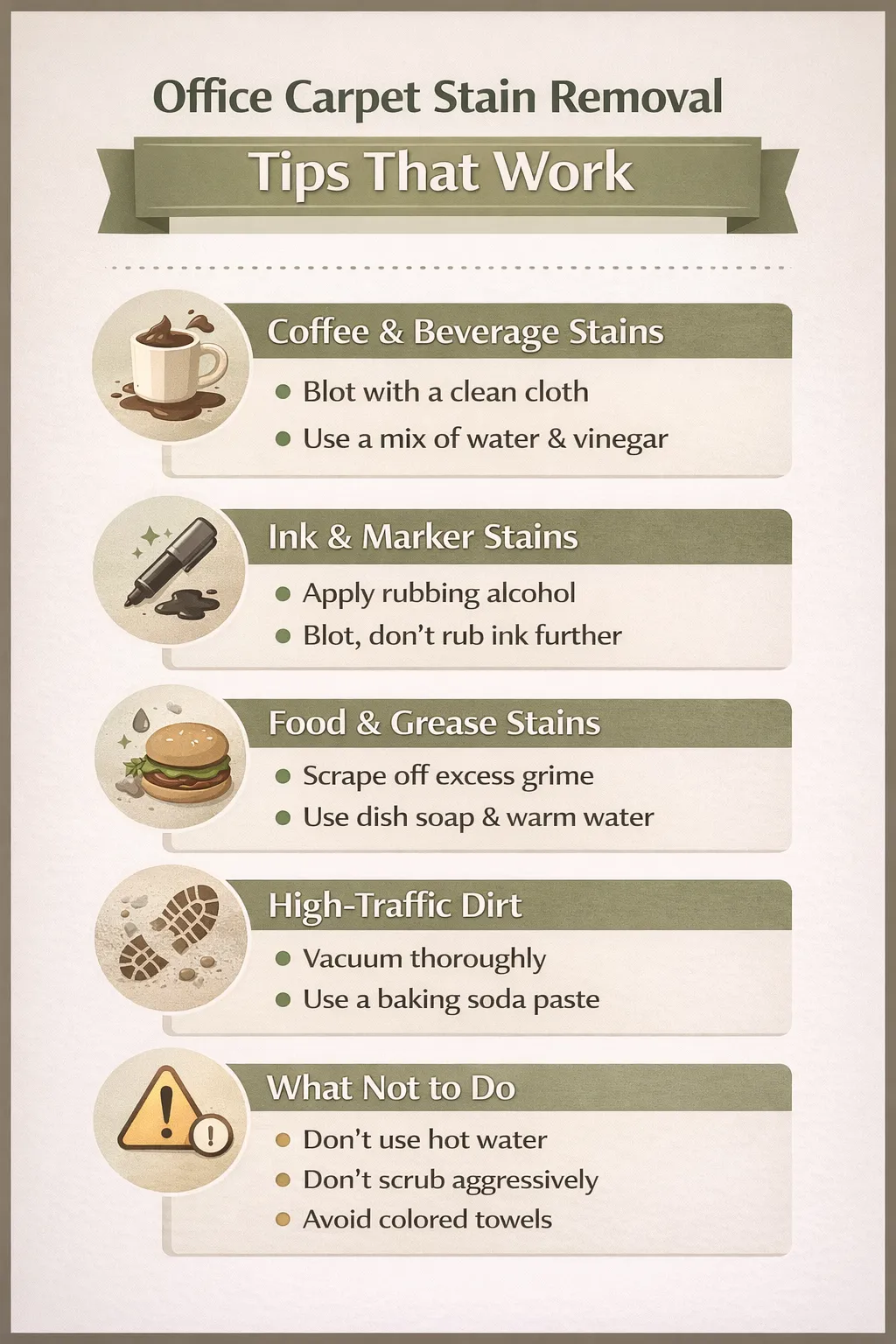 This guide shares proven, real-world stain removal methods that facility managers, office admins, and professional cleaners actually use—not “viral hacks” that can set stains permanently, weaken carpet backing, or leave behind sticky residue that attracts even more dirt.