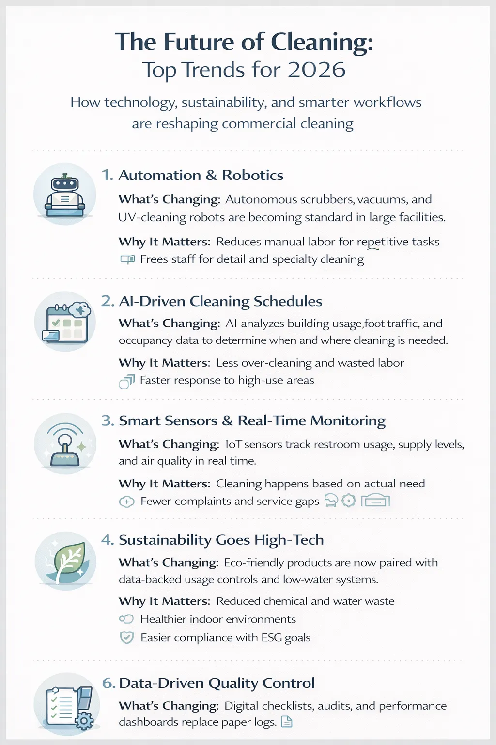 Smart cleaning isn’t “future talk” anymore—it’s quickly becoming the baseline for commercial cleaning programs because it solves three real problems at once: labor shortages, consistency, and proof of performance. Industry leaders are increasingly pointing to robotics, data analytics, and connected equipment as the direction the sector is moving.